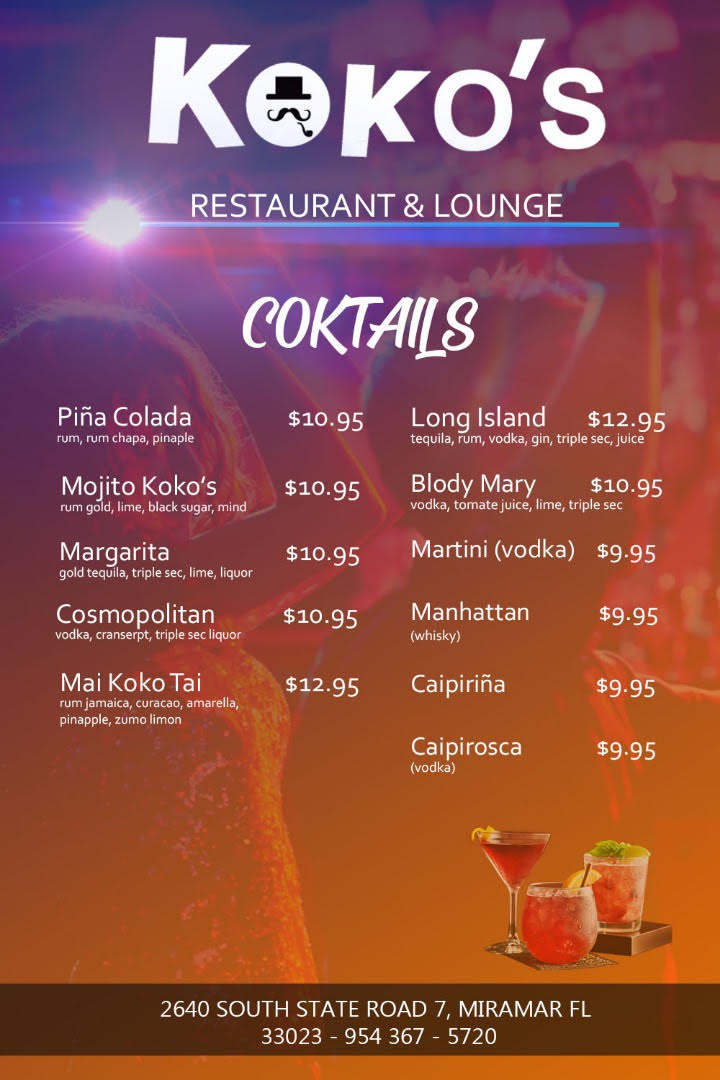 If you're looking for a place to indulge in a vibrant mix of flavors, Koko's Restaurant & Lounge Menu has something to excite every palate. Located at 2640 S State Rd 7 in Miramar, FL, this spot offers an unforgettable dining experience with an extensive menu that combines traditional favorites with innovative dishes. Whether you're in the mood for something light or craving a hearty meal, the menu here never disappoints. From fresh seafood options to savory meats and colorful salads, there's plenty to explore. The atmosphere is as inviting as the food, making it perfect for both casual meals and special gatherings. Every dish is crafted to offer bold, satisfying flavors, making it easy to find a new favorite every time you visit. Whether you’re stopping by for lunch, dinner, or enjoying a relaxing evening out, the menu at Koko’s promises something delightful for everyone.